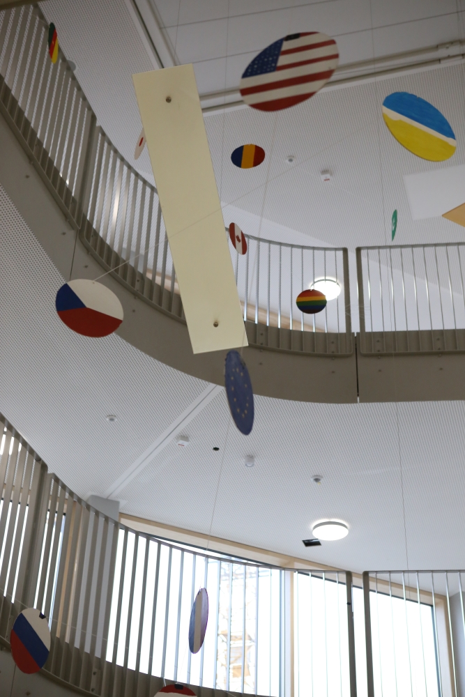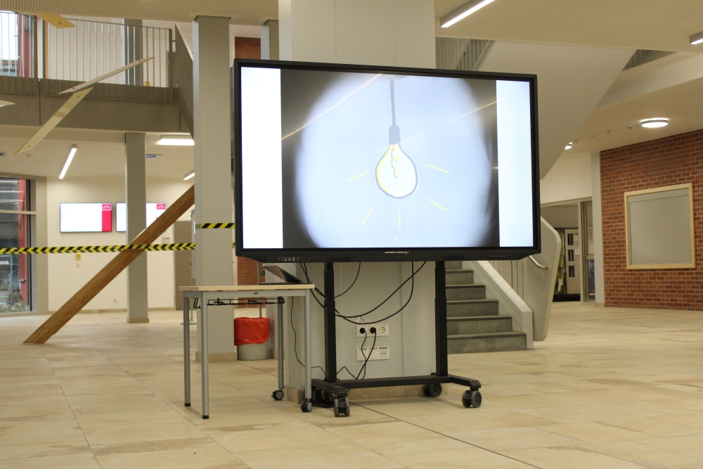 In der Ausstellung am 14.Dezember 2021 waren dann vielfältige künstlerische Herangehensweisen als Ergebnisse dieses Arbeitsprozesses zu sehen: Magdalena Humps und Lena Muschner zeigten am Eingang der Aula als Einstieg in die multimediale Ausstellung wechselnde Videoanimationen wie z.B. einen wegfliegenden bzw. landenden Schmetterling als kurze Momente der Unterbrechung vom Schulalltag. Francois Ndounokon, Minnah Qaiser und Jakob Weigl erinnerten in verschiedenen Rauminstallationen mit dem Titel „Retrospektive“ an das alte Schulgebäude. So wurde für die Ausstellung u.a. ein altes Treppengeländer des ehemaligen C-Baus als Relikt in die neue Aula re-installiert. Jasmin Vogl und Lea Geigenberger verwandelten das SMV-Zimmer zu einem Guckkasten, in dem eine Videoinstallation mit dem Titel „World Wide Waste“ betrachtet werden konnte. Jessica Weber und Ann-Sophie Steindl setzten sich in ihren wandfüllenden Videoprojektionen mit Zwischenräumen, sogenannten „Liminal Spaces“, auseinander. Elisabeth Schindler zeigte eine Lichtskulptur mit dem Titel „Wings for free“, die als Fotohintergrund zur Selbstinszenierung einlud. Alexander Wilhelm, Emre Aktas und Patrick Müller nutzten wiederum die Lautsprecheranlage der Schule, sowie weitere selbst platzierte Lautsprecher für weihnachtliche Soundinterventionen.